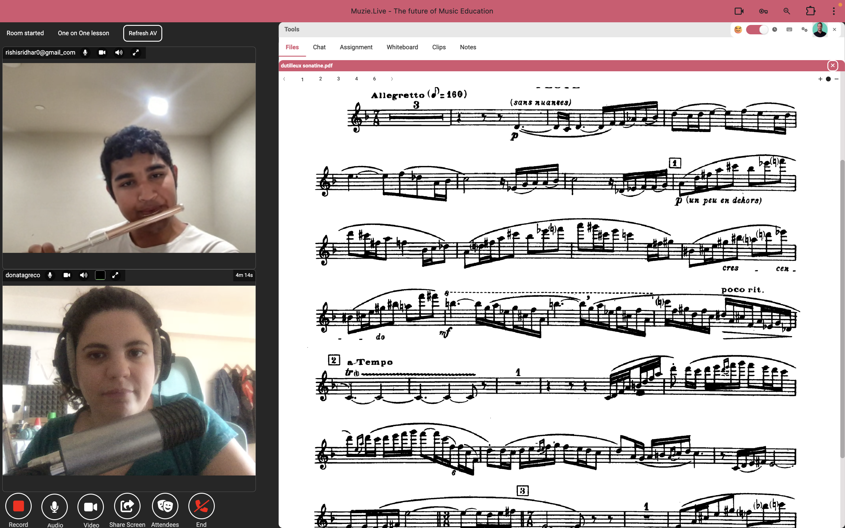 Utilizzo un software gratuito per lo studente, si chiama Muzie. Fornirò io l'accesso. Lo ritengo molto comodo perché ha degli ottimi strumenti per l'insegnamento: una cartella condivisa consultabile in qualsiasi momento, in cui si possono aggiungere file pdf, ma anche appunti presi a lezione, un assegno, un metronomo online e la possibilità di registrare frammenti di lezione in tempo reale per riferimenti futuri.Istruzione verificata